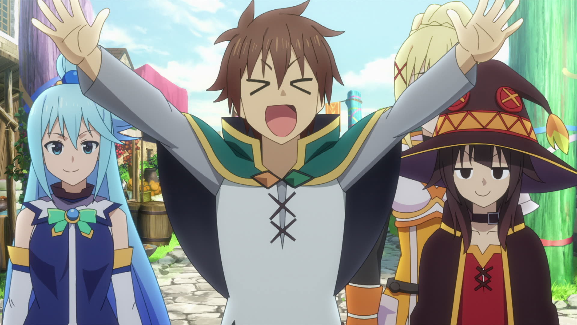 An unaired episode bundled with the 12th volume of the light novel. After returning from his trip to Arcanretia, Kazuma is living life without a care in the world, thanks to his debts being all paid off by the reward money he earned from eliminating one of the Devil King's generals, Hans. One day, a rookie adventurer named Ran comes up to him in the Guild Hall asking for a handshake. She's apparently become a fan of Kazuma after his consecutive defeat of the Devil King's generals! This puts him in an amazing mood, but it's not long before the Guild receptionist Luna appears, asking him to take on a quest to eliminate a golem. Wanting to look good in front of a fan, Kazuma ends up accepting, and heads towards ancient ruins with Aqua, Megumin, and Darkness in tow. (Source: Crunchyroll)