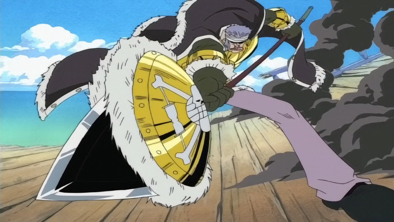 Mihawk departs after defeating Zoro, and Krieg continues his assault on the Baratie. Pearl, one of Krieg's strongest men, goes on the offensive with fiery attacks and multiple shields at his disposal, so Sanji reveals his unique fighting style.